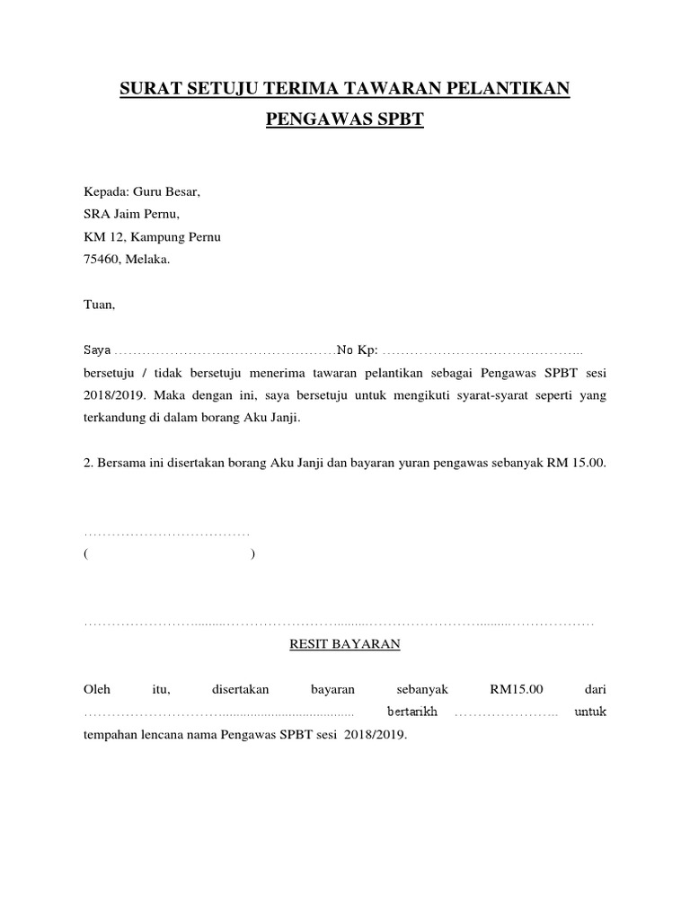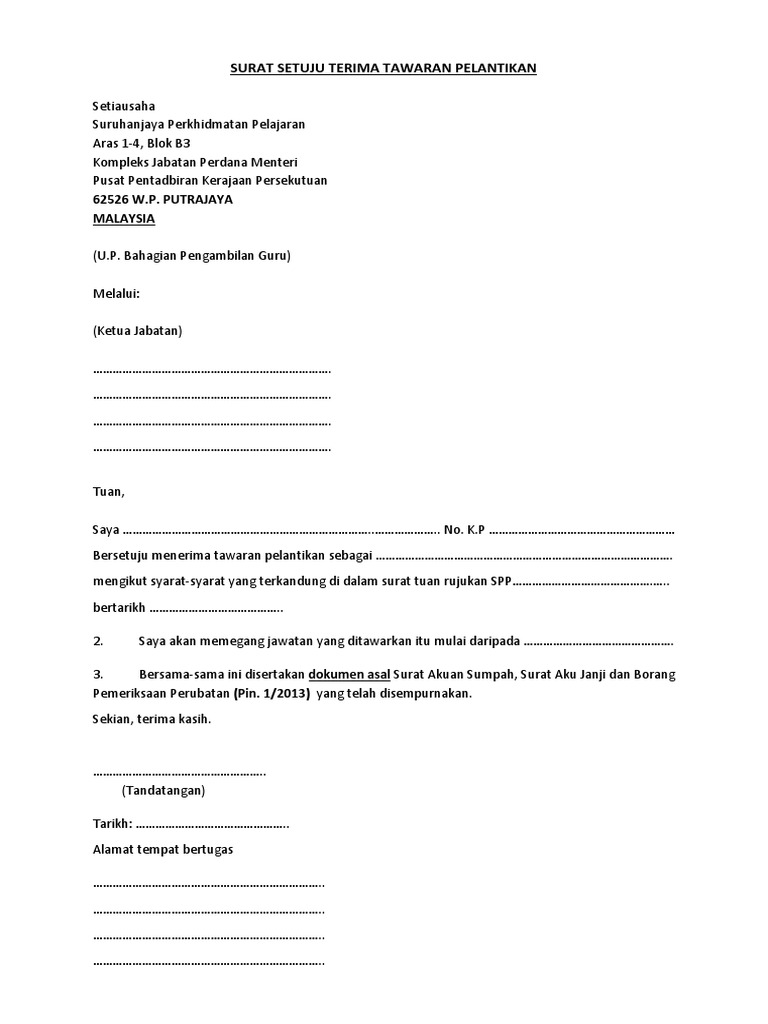 Contextual translation of surat setuju terima tawaran pelantikan into english. Calon perlu memberi jawapan sama ada terima atau tidak. Surat dah sampai, tunggu surat dari jabatan pulak. Surat setuju terima tawaran pelantikan. Atas perhatian yang bapak/ibu berikan, saya ucapkan terima kasih. Baca tawaran pekerjaan dan buat daftar pertanyaan yang kamu pikirkan saat membacanya. Pelantikan ahmad fuzi sebagai tyt pulau pinang kelapan berkuatkuasa esok. Pikirkan semua yang kamu harus selesaikan sebelum memulai hari. Selain itu, penulisan surat tanda terima juga tidak perlu panjang lebar, namun contoh surat tanda terima tersebut nantinya bisa anda pergunakan di berbagai kepentingan. Kemudian jadwalkan sebuah janji untuk berikut dua pertanyaan paling penting untuk diajukan sebelum menerima tawaran pekerjaan. Untuk melihat detail lagu surat setuju terima tawaran perlantikan dg41 klik salah satu judul yang cocok, kemudian untuk link download surat setuju terima tawaran perlantikan dg41 ada di halaman berikutnya. Anda mendapat tawaran bekerja dalam jabatan perkhidmatan awam? Dalam tempoh 60 hari dari tarikh lapor diri atau tawaran akan terbatal senarai dokumen 1.