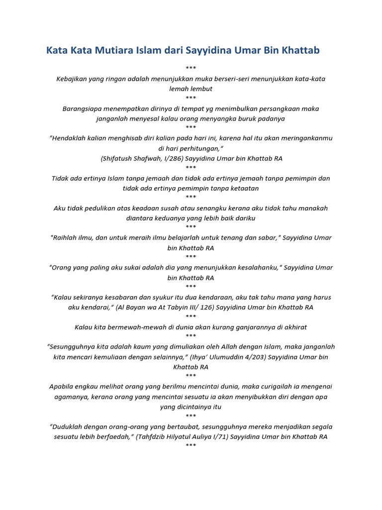 Words of caliph khalifah saidina umar al kattab, seorang pemimpin islam yang tegas, adil dan bijaksana, beliau mempunyai tubuh tegap dan sasa sehingga. Jadikan pengalaman sedihmu sebagai pelajaran berharga, agar kamu bisa lebih kuat lagi. Selain untuk memberikan semangat, kata kata motivasi ini juga akan menyadarkan pembaca untuk terus mensyukuri nikmat kehidupan. Kkhattab pentadbir yang ulung disediakan oleh : Sayyidina umar bin kaththab r.a begitu populer dalam sejarah keislaman. Padahal, aku ini sahabat nabi, kata beliau. Dan tidak mengapa menambahkan kata sayyidina sebelum muhammad. Ada kata kata cinta romantis, cinta dalam diam, dan menyentuh hati. Wahai amirul mukminin, aku datang kepadamu. Selamat datang di klik kata, sebuah media online yang banyak menyajikan berbagai macam tema kata bijak, kata mutiara, inspirasi, nasehat, quotes, dan sejenisnya. Dalam kehidupan kita, sedih dan bahagia bagaikan dua mata uang yang datang silih berganti tanpa permisi lebih dahulu. Berisi kata kata mutiara kehidupan, cinta, islam, untuk sahabat, lucu, serta kata mutiara bijak singkat indah yang mengisnpirasi. Kod rahsia tersembunyi untuk android.